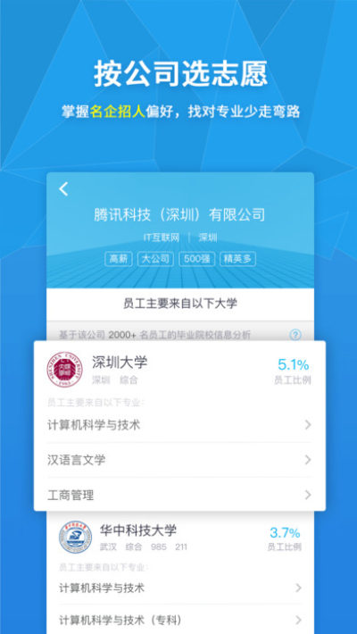 1、查看中国全部2183所大学的过去十年的真实就业情况(薪酬、稳定性、企业认可度、就业面等)、学校概况、评级、分数线、专业设置;