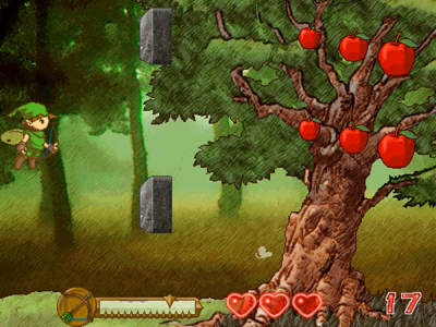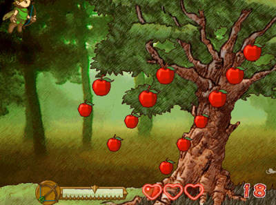 射苹果是一款很简单但是很有意思的小游戏。玩家扮演一名小精灵,要用弓箭射落所有树上的苹果,每一关的时间都很短,有时还会有大量的障碍物。玩家需要以最快的方式射落苹果,不然时间过后就会损失一格生命,这不光需要掌握好角度,同时还有对力度的把握。关卡之间的缓冲也很短,所以游戏显得非常的紧凑,一关接着一关,让人停不下来。