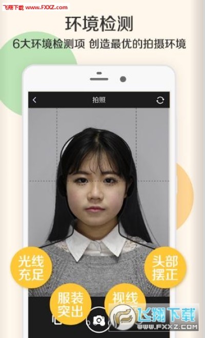 严格的拍摄环境检测,对人脸姿态、眼睛视线、双眼水平、服装突出、肩膀水平、光照充足、光线均匀进行检测,确保用户拍摄出合格的证件照。