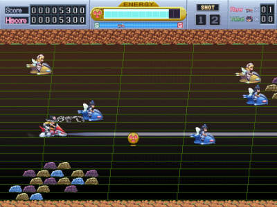 这是东方的动作日文同人游戏《東方セクロス》,会有三月精军团不端地从后面追上来。追上来的敌人都是有特点的,可以采取相应的办法对付。有三个机体可以选择,分别是灵梦,魔理沙,帕秋莉。