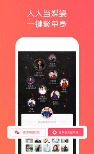 1号媒婆是一款基于社交关系网的创新婚恋平台,每个人都可以成为”媒婆”,让身边单身朋友注册为自己的单身团成员,并为单身的真实资料做信任背书,单身可以在平台上认识同一个媒婆下面的单身,以及其他媒婆的单身团,通过心动和互加微信号进行更深入的沟通。