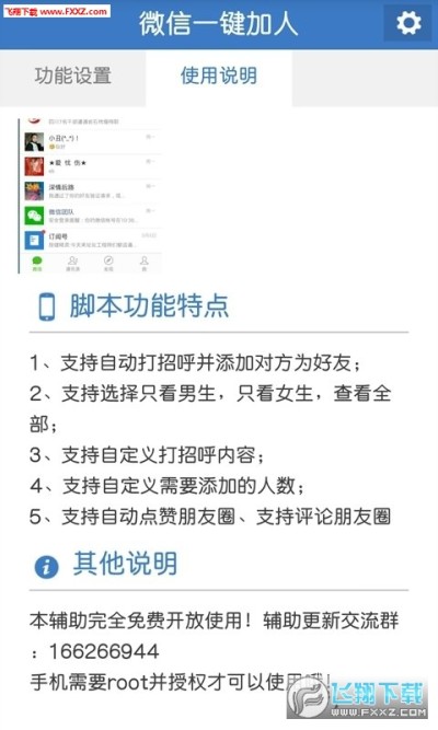 一款微信辅助工具,支持官方微信版本,模拟操作,安全绿色,体积小效率高,具有一键加人,一键点赞,一键评论等功能。