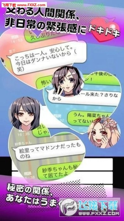 “秘密的关系...开始了”虽然知道这种禁忌的恋爱不能实现….但是,日常生活中偶尔发生一些不能公开的秘密关系…..感觉应该还不错吧!恋爱对象传来短讯也…..扑通扑通!把她/他们一举拿下!因为这款游戏完全不按套路来,你要同时跟多个异性保持恋爱关系,想要维持这段关系必须每个选项都选对,否则会导致感情破裂。秘密关系app中的男角都是玻璃心,当然你也可以切换成女性去攻略妹子,做一个脚踏N条船的渣男,还是做一个备胎无数的绿茶婊,随你选择。