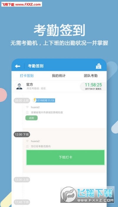 4、更方便管理的考勤打卡系统,让您可以不再为考勤机故障而烦恼,而且老板可以实时关注今天出勤的状况!、