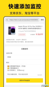 降价通知监测app官方版是为那些希望省钱的消费者提供帮助的软件。降价通知监测app可以监测商品的实时价格变化,并在商品价格降低到用户设定的价格阈值以下时,立即提醒用户。用户可以添加他们关注的商品,并设置价格阈值。