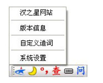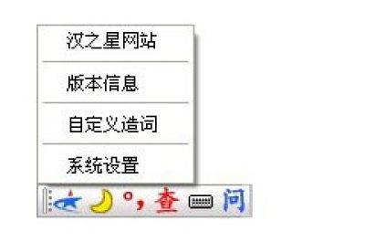 在输入状态条上,点击鼠标右键,将打开输入法系统菜单。菜单中的功能项包括汉之星网站、版本信息、自定义造词、系统设置。