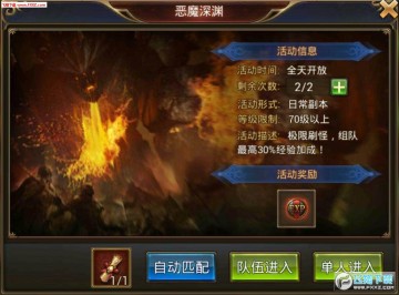 4、赏金任务每天必须完成,有大量的金币和经验;恶魔深渊更加是少不了(最好是在当天经验获得的任务都完成再打),它是经验获得最高的来源,建议组队一起打,有组队经验加成,同时最好能够进行鼓舞(如果是非R可以用金币鼓舞到50%,如果是土豪那么可以鼓舞到100%),经验丹也要吃(最好是2倍,没有的用1.5倍也行),打完恶魔深渊一般还要等3分钟左右才能再打下一次,这个时候可以去做一下单人副本或者直接挂机打怪,在经验丹的持续时间内把恶魔深渊都通关完。(当然啦,有钱的土豪可以提升vip等级增加购买次数)
