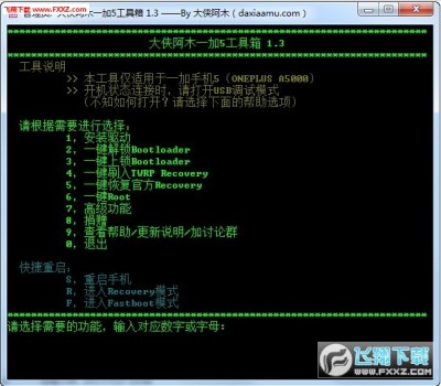 大侠阿木一加5刷机工具一个由网友大侠阿木打造的一加5刷机工具,大侠阿木一加5工具箱具有安装驱动、一键root、一键解锁bootloader、一键上锁bootloader等等功能,兼容与稳定性极强,刷机救砖必备的工具。