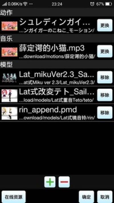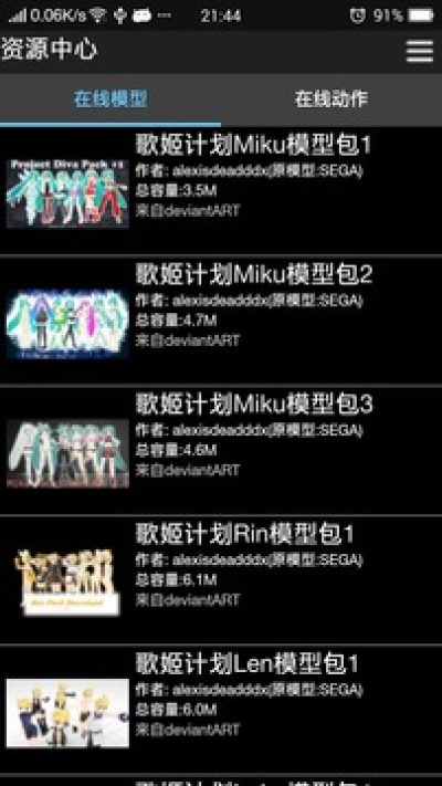 只有一个模型,一个曲子,是不是太无聊了?现在这个应用还不支持直接在界面上选歌和模型。不过如果愿意,你可以自己从网上下载mikumikudance的资源(啥是mikumikudance?自己百度去了解一下吧)。萌舞论坛和百度mikumikudance吧有不少资源。当然,你要是知道怎么从niconico找这种资源,那是更好(教教我呗。。。我不会。。。)。然后,到你手机的SD卡下面,找到MikuMikuDance这个文件夹(运行一次应用以后才会有)。把你的pmd模型、音乐、vmd动作放到SD卡根目录MikuMikuAR文件夹下的任意位置,点主界面右侧那个一页纸图标的按钮,然后点一键扫描,就能选自定义资源了。不过,现在这个应用对pmd的支持还不太好,有些模型的显示会有问题。我会努力修复。