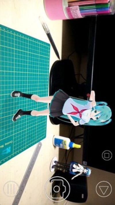 现在有这张图片了,不管是打印还是显示出来的,我们称它为AR卡。打开应用,把相机对着它,就像视频里那样,注意整个黑框要全部出现在相机的图像里一次才行,哈!成功召唤Miku!触摸播放按钮就能看Miku跳舞了。如果看不到Miku,换几个角度对着卡片试试。