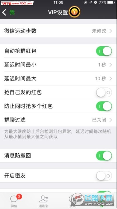 目前市面上最稳定、功能最全的 iOS 版微信增强版。双开、密友、聊天内容加密、实时后台推送、群红包自动抢、 随机延迟抢、过滤特殊群、消息防撤回、语音转发、运动步数修改、稳定防封