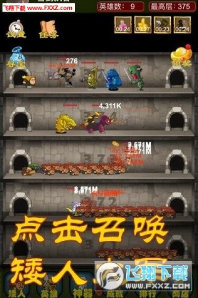 进入游戏,直接开启点击爬塔大作战,在任意楼层操纵鼠标便可以召唤咱们最原始的霍比特人,击杀怪物可以掉落金币,之后便可以提升等级与解锁各类技能了。与同类型的点击作品一样,后期随着资金的增多可以尝试下解锁形态各异的英雄,当然,品质越高,所需的金钱也越多,所以部分情况下积攒资金是很有必要的。