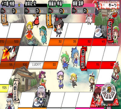 这个画风看似粗糙但是又充满爱的类似大富翁的游戏就是东方地镇祭,之前也有同类型的东方大富翁类游戏,千万不要将这个与未完童话的那一款大富翁弄混了。只可惜游戏是日文的,玩起来颇有些吃力,只能凭这自己多年大富翁游戏的经验一点点的摸索。