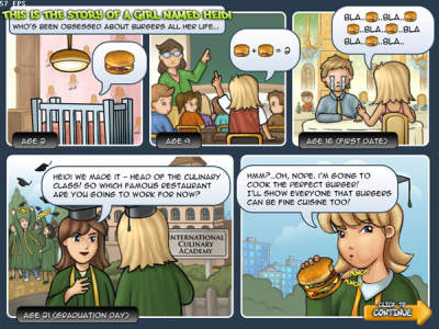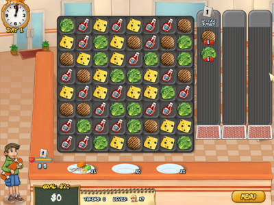 汉堡餐厅是一款休闲益智的消去类游戏,游戏的剧情讲述的是一个热爱汉堡的女孩为了向公众证明汉堡也可以是精致的菜肴,但找工作时的种种困境激发她开一家自己的汉堡店的想法,她能够实现自己的梦想么。游戏的玩法类似于厨师团队,客人排队等候提出要求,你来烹饪然后交给客人,客人付款。在客人等待的时候心情会随时间而降低。而与厨师团队不同的是,你要做的不是模拟烹饪,而是进行交换式消去,通过消去客人需要的食材来烹饪出美味的汉堡。