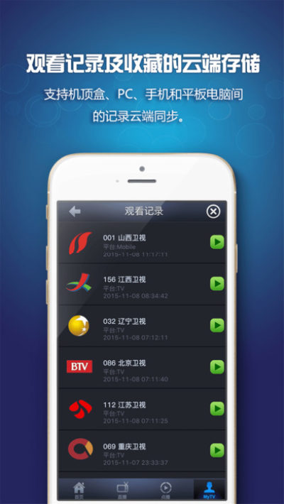 3、观看记录及收藏的云端存储。支持机顶盒、PC、手机和平板电脑间的记录云端同步。