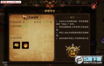 群雄夺宝活动每天两次,活动开始后,地图会出现一个BOSS,杀掉BOSS会爆一个宝箱,拿到宝箱的玩家每分钟都会获得随机奖励,活动结束后,获得宝箱的玩家打开宝箱会有很大几率获得100元宝,我们之前开宝箱,10次有9次都是元宝,开不到元宝的都是手黑的,拖出去打屁屁。。。。