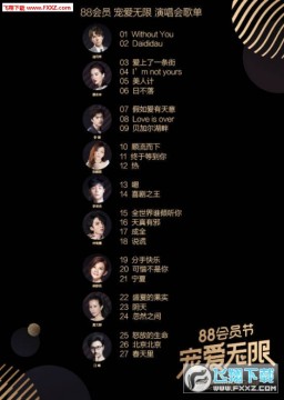 88会员节宠爱无限全明星演唱会阿里巴巴为平台上的超级会员及优酷全网举办了这台名为“宠爱无限”的演唱会,本场演唱会请到了超强大的明星阵容:亚洲百变天后蔡依林 、亚洲新天王李荣浩、唱作音乐人汪峰、音乐诗人李健、亚洲金曲天后莫文蔚、live小天王林宥嘉、哈萨克斯坦国宝级天籁迪玛希、亚洲情歌天后梁静茹、华语乐坛实力天后张靓颖。
