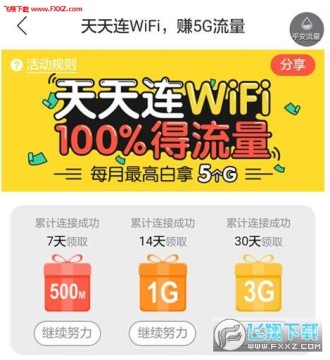 同时,用户从参与连接任务成功之日起的30天内,天天连WiFi,累计达到7天可以获得500M的平安流量;累计达到14天可获得1G的平安流量;累计达到30天即可获得3G的平安流量。由此推算,用户只要连续30日通过平安优联连上WiFi,加上每日的随机额度流量,总计可以获得5G的平安流量。