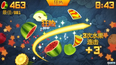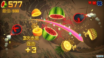 游戏的操作极为简单,屏幕上会不断跳出各种水果——西瓜、凤梨、猕猴桃、草莓、蓝莓、香蕉、石榴、杨桃、苹果、火龙果等,玩家看到抛出的水果看准用手指在屏幕上移动划过去,就可以像忍者战士一样痛快地斩开水果了,在它们掉落之前要快速地全部砍掉;