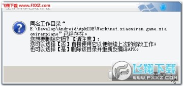 在打开Apk文件时Apk改之理会先对其进行基本的解析(包括它的名称、包、权限等),然后根据该apk应用的包名生成它的同名工作目录,如果这个工作目录已经存在,Apk改之理会询问是否要重新反编译Apk。这里要注意,已有的工作目录通常是你以前修改这个Apk应用时所生成的工作目录,如果你要继续这个修改操作,则单击[否]继续使用它,否则就重新反编译得到一个全新的源代码。
