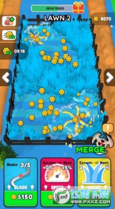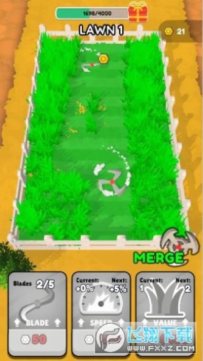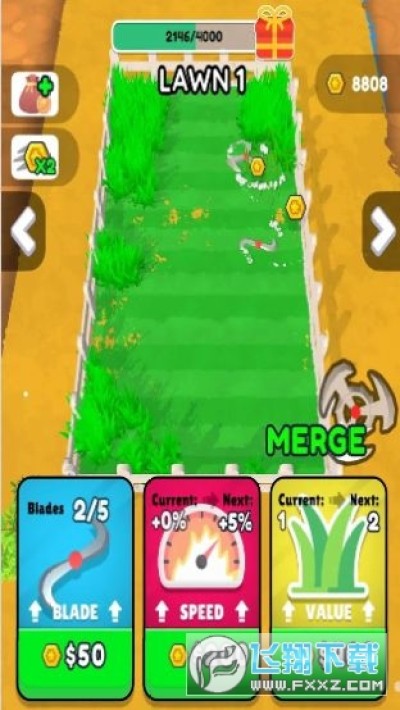 2、合并割草机中利用你赚取到的金币,合并升级你的割草机,获得更高效率和性能;