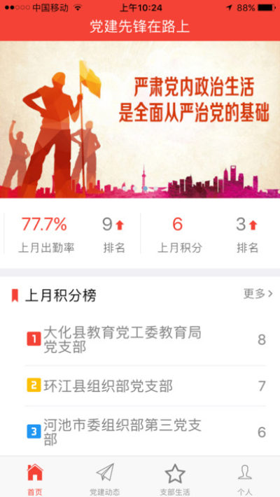 “党建先锋在路上”APP,基于“党建+”理念,河池市委组织部运用党员现代远程教育创新搭建“党建先锋在路上” 学习管理平台,平台以市、县、乡(镇)、村四级党组织为基本构架,各基层党支部可用手机即时将“三会一课”信息上传至平台,党员经过授权进行登录学习、参加支部生活。