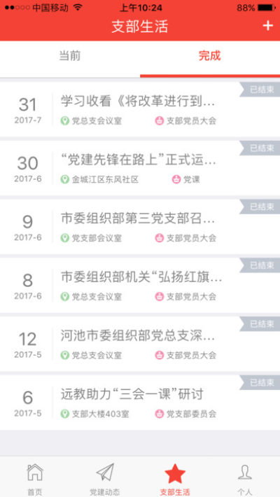 会议记录上传:在“支部生活”菜单中找到需要撰写会议记录的会议(“当前”会议或“完成”会议)→点击查看详情→在“详情”中找到撰写会议记录的位置→管理员通过手机上传会议记录至手机APP;