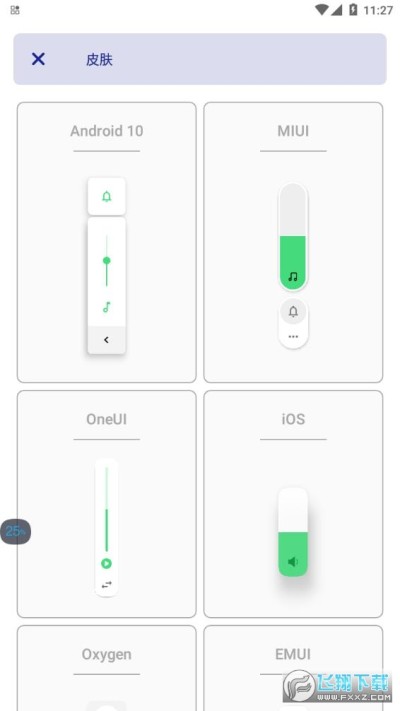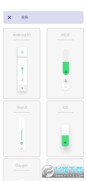 3、如果你想解锁更多姿势,点击首页的皮肤按钮,更换各种类型的皮肤,这里提供了14种音量面板皮肤,Android10、MIUI、OneUI、EMUI等等常见的不同手机音量样式。
