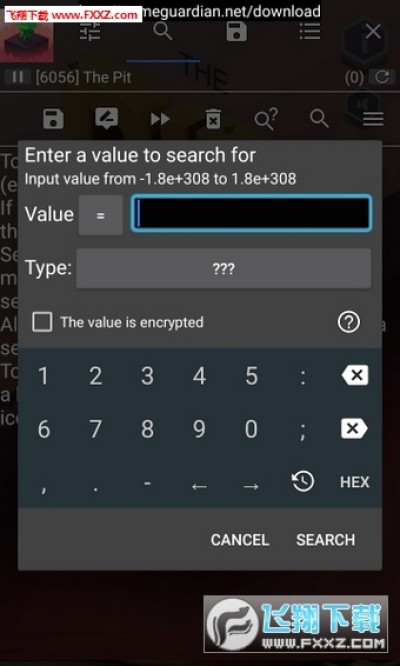 C.游戏属性值的搜索 1.在游戏中点击Guardian图标 2.点击“搜索”选项卡 3.点击“搜索”按钮进行搜索属性值 4.按“返回”键继续你的游戏 5.重复1〜 3步骤,直到找到确切的地址 6.点击地址,并将其保存 7.点击清除按钮,以搜索游戏中下一个属性值