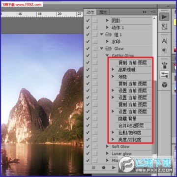 可以看到,这个动作是一个组,里面包含了多个动作,点开其中的一个动作,就可以看到具体的步骤,也是学习ps的一个好方法