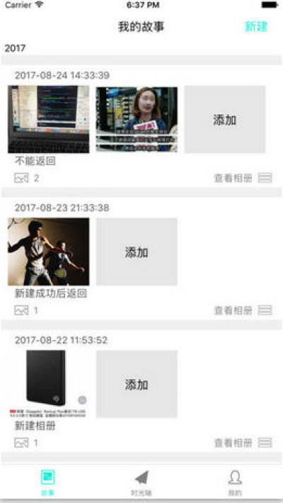 2.时光轴页面中部有醒目的红色上传按钮。(提醒:没有创建过故事的用户上传照片会自动转向“开启新故事”页面,您必须先创建一个新故事才能上传图片。);