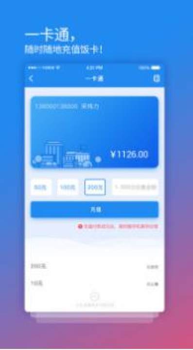 进入主界面后点击“ ”符号绑定饭卡,输入你的学号和姓名后点击确定,就可以清楚看到你的饭卡余额了,接下来,同学们就可以选择点击或输入想充值的饭卡费用,确定后点击“立即充值”