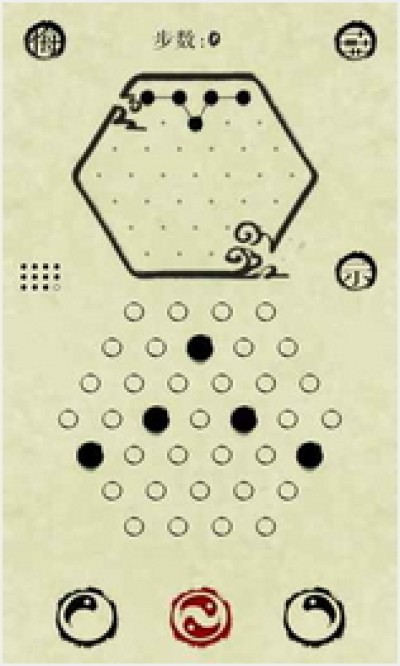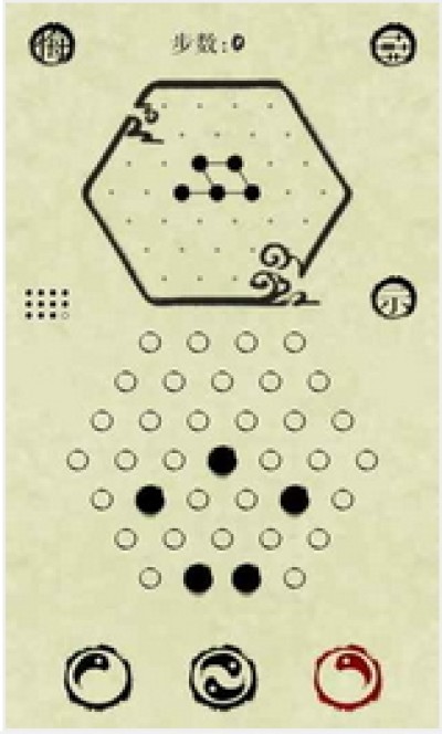 《墨盘》是一款拥有独特创新游戏玩法的休闲益智游戏。墨点与墨圈拼成六边形阵列,点击一个非边缘点,同一六边形顶点的墨点与墨圈联动。有三种联动方式:顺时针一格、逆时针一格、对角互换。经过变换,拼成目标图案即可通关。