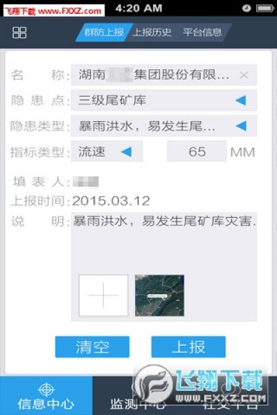 信息中心:群防人员通过文字或图片的方式,上传隐患点的实时监测情况,并提供历史上报详情的查询。