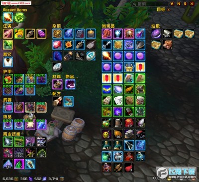 AdiBags整合分类背包插件,对所有背包和银行进行整合,将物品按类型和用途自动分类,并自带搜索功能。