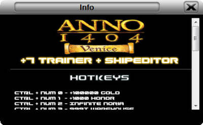 本修改器仅适用于纪元1404资料片<威尼斯>,修改的界面很漂亮,富有科技感,可以修改7项属性,功能也算比较丰富.