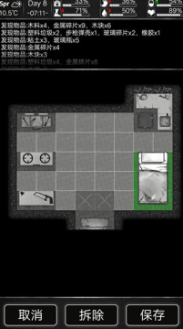 5、第一天搜一栋楼,擦掉家具回家做弓、弓箭、网子、手提袋。继续搜,只搜不拆。食物能称个几天后,回家升家具,做铁铲,斧头,开始拆家。