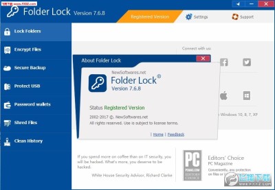 NewDoftwares Folder Lock 可以帮助你将重要的文件,文件夹,图片,文档,多媒体文件或者任意类型的文件进行加密隐藏处理或者加上访问控制密码,加密速度飞快,对1GB的数据进行处理也只需要很短的几秒钟的时间。但只能将你的保密资料放在一个目录里加密,不能对这个目录之外的资料进行加密。