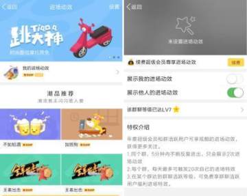 进入页面后可以开启进群特效功能,也可以设置是否显示别人进群特效。开通这个进场特效功能需要开通了年费超级会员才可以设置,自己和群内成员都可看到 5分钟之内重复进出 只会出现2次特效。
