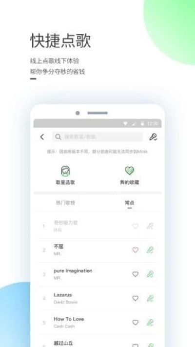 •点歌:点击曲目后的话筒图标, 图标变绿代表已经点过的曲目;