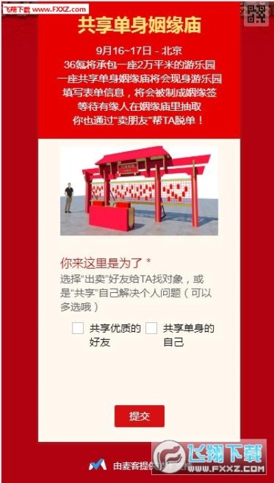 36氪孵化的“共享单身”项目正式上线了共享单身姻缘庙9.16~9.17登陆36氪首届互联网粉丝节#没想到游乐园# ,线上参与填写表单,线下也等你来求取姻缘签噢!不仅可以共享自己,还可以共享好友哦