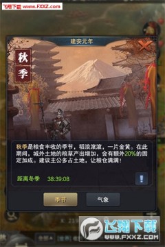 当然,四季变换的设定并不只是为了丰富视觉元素,更重要的是,不同的季节还有不同的增减益效果。比如春季的具体效果是士兵兵营的时间加成,即在春天招募任何兵种,都可以额外增加25%的士兵数量,而同时,士兵生产时间缩短20%。而夏季则是兵戈交战的最好时机,此时的士兵能轻装上阵,从而使行军速度提升30%。秋天是丰收的季节,因而外城粮草收益会有额外20%的加成。而冬季则是最难熬的季节,严寒的天气会使守城士兵的攻击力和防御力大大下降,直接导致城防值减低20%。而此时,却正是敌人最易发动袭击的时候,主公最应加强防御,休养生息。
