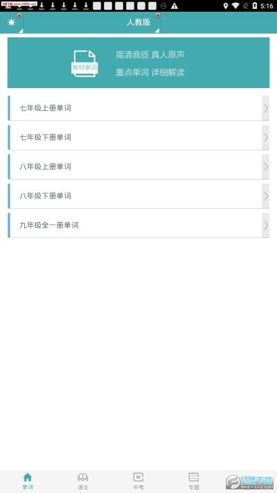 (4)中考单词。中考核心单词辅导,高清配音,可跟读、可点读。所有单词都带详细讲解。