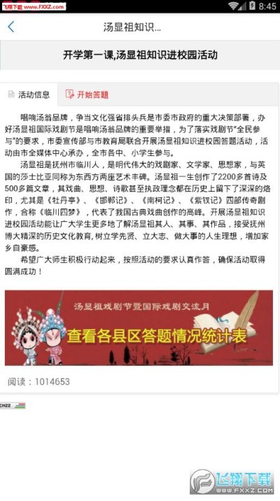 汤显祖知识进校园问答答题官方平台已经上线了,戏曲是抚州非常重要的一个地方特色,只要你正确的回答出了汤显祖知识进校园问答答案,就可以获得非常丰厚的奖励哦,想要提升自己课外知识的小伙伴们快来下载魅力抚州客户端体验一下试试吧