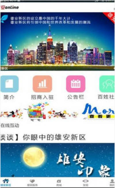 另为本地居民提供了手机交费、美食、住宿、购物、医疗预约等多种便民工具的入口,更是打造了本地生活圈概念,利用社区、圈吧等功能构建雄安信息互动版块。雄安在线,全方位服务于雄安百姓。