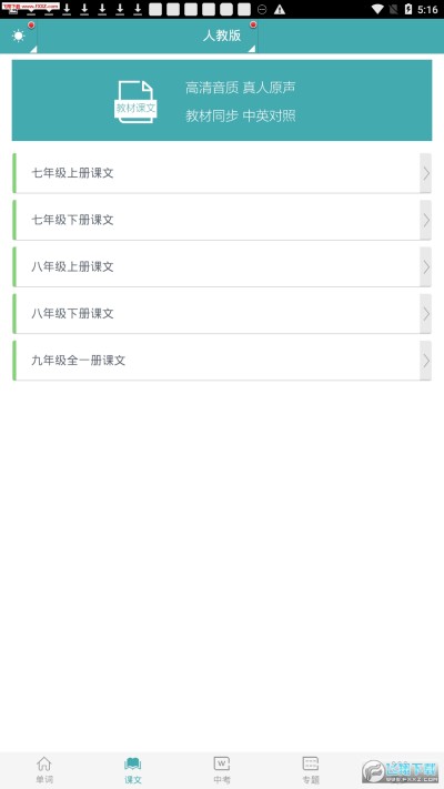 包含七年级到九年级的单词和课文,都配有高清的真人发音,可跟读、可点读。