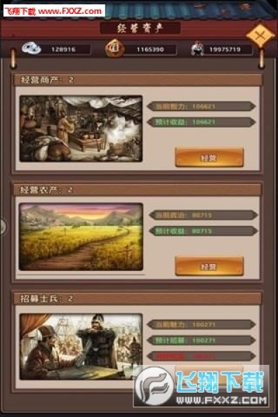 游戏属性为魅力武力、政治、智力、武力,四项属性的综合加起来就是玩家的势力值,这些属性主要通过强化门客来增加