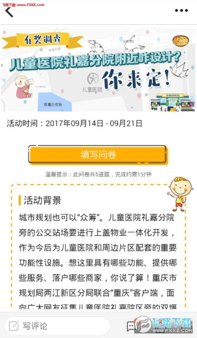 由重庆市规划局两江新区分局联合“重庆”客户端主办的有奖问卷活动正式开始。轻松回答五道题,就可以参与儿童医院礼嘉院区附近综合体的规划建设,不仅能让孩子在你设计的房子里玩耍,还能赢幸运奖品。