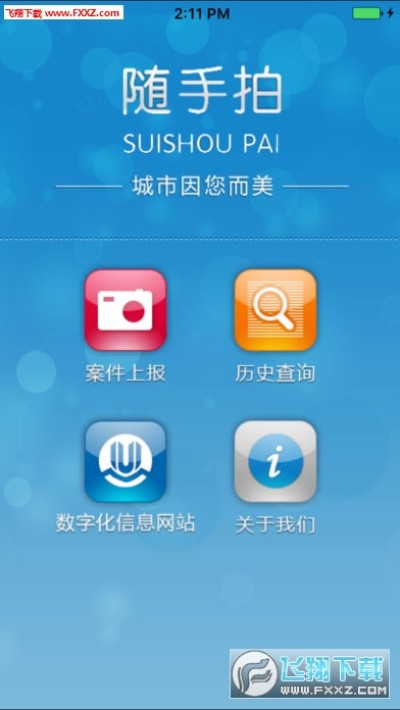 第2步,进入应用:安装完成后,回到手机桌面,点击“市民随手拍”快捷图标,进入应用主菜单页面(您可以看到“案件上报”、“历史查询”、“数字城管网站“、“关于我们”四大功能模块);
