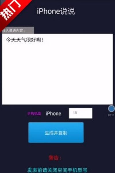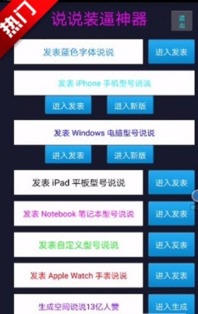 1、用户可以通过说说装逼神器手机版在线发表空间说说。说说里并带有iPhone手机型号、蓝色字体说说、iPad型号说说和自定义型号说说等。